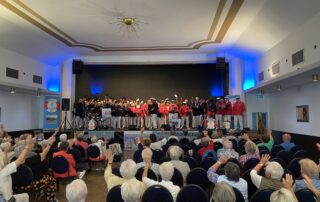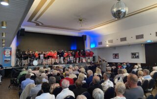 Der sicherlich eindrücklichste Moment des Konzertes war das gemeinsame Singen beider Chöre auf der Bühne. 70 Sänger standen und schunkelten dicht an dicht, sodass bei den Abschlussliedern „Bye bye my Roseanna“ und „In Rheine sagt man >>tschüss<<“ die ganze Bühne wogte.